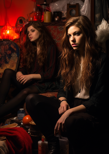 a 19-year-old college student and teenage hippie witch sitting on the edge of her bed in a typical teenage bedroom in 2015, long brown hair, bohemian-style clothing, combining the looks of Natalie Dormer and Katheryn Winnick, Penny Dreadful, photorealistic --ar 5:7 --v 5.2