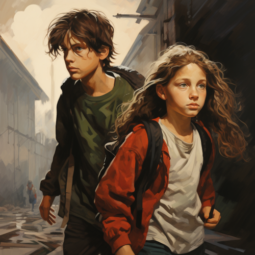 realistic colorful Illustration, photorealistic two teenage boys 14 years old and one girl 13 years old in post-acalyptic picture of a nuclear explosion, --ar 2:3