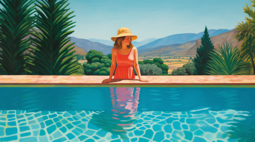 By David Hockney create a high - performance colorful art print with a focus on negative space and limited color palettes. The composition is minimal, with a young beautiful 30 years old woman inon a beach swimming pool in nayarit full of palms . The painting is in traditional art forms, rendered in both acrylic and oil paint. The floral elements are so intricately detailed that they almost appear three - dimensional, and the with exaggerated features and clothing in bold shades of pink and white. Overall, the painting is a celebration of the beauty and wonder of nature, and a true masterpiece of contemporary art. --ar 16:9