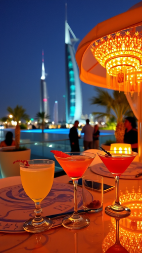 Dubai at night, with glowing neon lights, the majestic Burj Khalifa, and intricate Arabic geometric patterns in the foreground, representing the city’s unique blend of innovation and tradition.NFT art with 3d pop-up in main elements