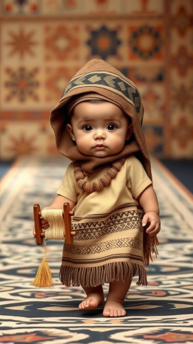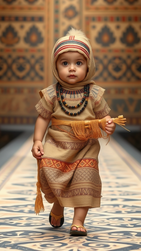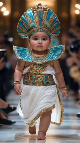A realistic photo of a chubby Egyptian baby girl posing like a supermodel, walking down the runway and looking toward the camera. The dress is inspired by Cleopatra, a fitted white gown featuring turquoise and gold embellishments on the belt and shoulder decorations. She wears an elaborate headdress with a fan-shaped design in gold and blue, adorned with intricate details. Her face is chubby with round cheeks. The setting resembles a fashion show, haute couture, with the style of a high-quality fashion magazine cover. She is walking down the runway at Paris Fashion Week, with celebrities and photographers seated on either side. --ar 9:16 --seed 3290765572 --style raw