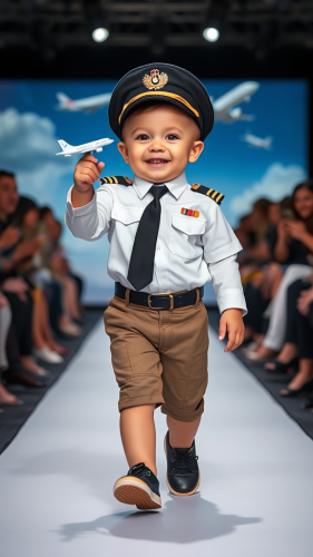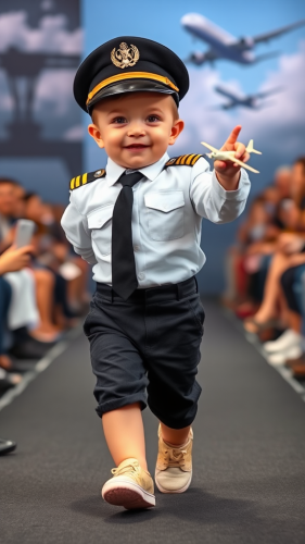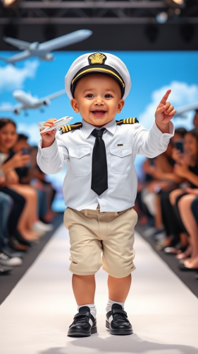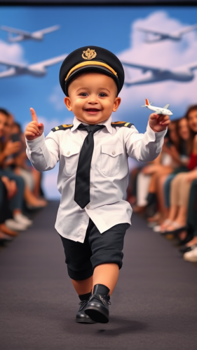 A super cute baby with a bright smile, walking confidently on a runway, perfect for a TikTok aesthetic, dressed in a tiny pilot’s uniform. The outfit features a crisp white shirt with gold-trimmed epaulettes, a black tie, and a matching pilot’s hat. The baby is holding a miniature airplane model in one hand, symbolizing the pilot's role, while pointing toward the sky with the other hand, creating a sense of adventure and flight. The baby is seen in a full-body view from head to toe, smiling joyfully, embodying the dream of flying. The background is set like a contemporary fashion show, with airplane visuals and clouds in the backdrop, emphasizing the aviation theme. The audience on both sides of the runway is captivated, smiling and taking photos, impressed by the baby’s confident, pilot-inspired style and playful reference to flying. --ar 9:16