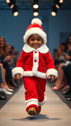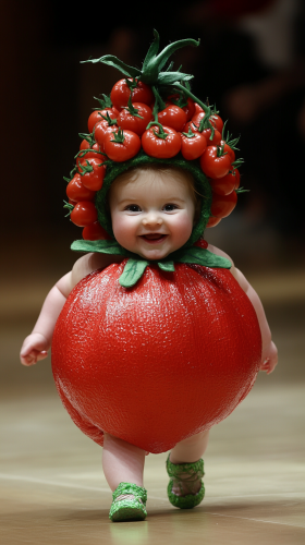 A super cute smile baby walking confidently on a runway, perfect for a TikTok aesthetic, dressed in a trendy, pizza-inspired outfit. The costume features a playful, flared dress with a warm, golden crust-colored base, adorned with vibrant red, green, and yellow accents that represent classic pizza toppings like tomatoes, basil, and cheese. The dress is designed with a triangular, slice-like silhouette that is both eye-catching and stylish. The fabric is textured to subtly suggest the look of melted cheese and crispy edges, while a cute, pepperoni-patterned headband adds a whimsical touch. The baby is seen in a full-body view from head to toe, showcasing the fun and creative outfit. The background is set like a contemporary fashion show, with bright, lively lighting that highlights the outfit's deliciously innovative design. The audience on both sides of the runway is captivated, smiling and taking photos, enchanted by the baby’s chic and pizza-inspired fashion. --ar 16:9
