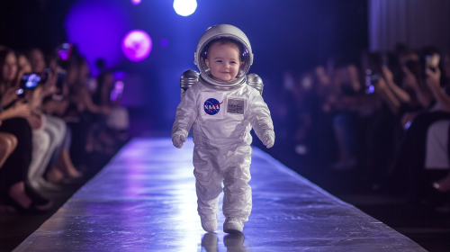 A super cute baby walking confidently on a runway, perfect for a TikTok aesthetic, dressed in a tiny astronaut’s spacesuit. The outfit features a sleek, white spacesuit with shiny silver accents, complete with a small, rounded helmet that perfectly fits the baby’s head. The spacesuit includes mini oxygen tanks on the back and a NASA-inspired patch on the chest, adding an authentic space explorer touch. The baby is seen in a full-body view from head to toe, smiling joyfully while showcasing the adorable astronaut look. The background is set like a futuristic space-themed fashion show, with glowing stars and planets in the backdrop. The audience on both sides of the runway is captivated, smiling and taking photos, charmed by the baby’s astronaut-inspired style, embodying the wonder of space exploration. --ar 16:9