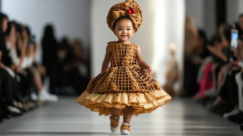 A super cute baby walking confidently on a runway, perfect for a TikTok aesthetic, dressed in a fashion-forward, ramen-inspired outfit. The costume features a chic, swirling noodle pattern woven into a stylish, high-fashion dress with accents of golden broths and sleek lines that suggest the richness of ramen. The top is adorned with elegant embellishments reminiscent of green onions and a minimalist, egg-shaped brooch. A headpiece that subtly nods to the shape of chopsticks completes the look, adding a touch of playfulness without overwhelming the design. The baby is seen in a full-body view from head to toe, showcasing the avant-garde and whimsical outfit. The background is set like a contemporary fashion show, with bright, modern lighting that highlights the outfit's innovative design. The audience on both sides of the runway is captivated, smiling and taking photos, charmed by the baby’s chic and noodle-inspired fashion. --ar 16:9