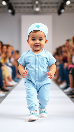 A super cute baby with a beaming smile, walking confidently on a runway, perfect for a TikTok aesthetic, dressed in a tiny police officer’s uniform. The outfit features a navy-blue shirt and pants, complete with a small police badge on the chest and a tiny cap to match. The baby is seen in a full-body view from head to toe, grinning joyfully while presenting a bold and adorable look. The background is set like a contemporary fashion show, with dynamic, urban lighting that highlights the uniform’s authoritative design. The audience on both sides of the runway is smiling and taking photos, charmed by the baby’s joyful and police-inspired style. --ar 16:9