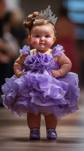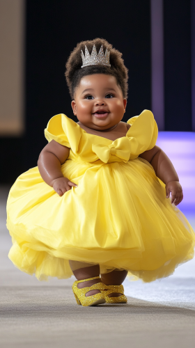 A realistic photo of a chubby baby posing like a model, with one hand on her hip, walking down the runway and smiling toward the camera. She is dressed in a lemon-yellow dress, reminiscent of a princess gown from a Disney movie. Captured in a cute full-body pose, she is wearing high heels, a voluminous hairstyle, and a small tiara on her large head. Her face is chubby with round cheeks. The setting resembles a high-fashion show, haute couture, with the style of a high-quality fashion magazine cover. --ar 9:16 --seed 3290765572 --style raw