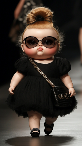 In a realistic photo, a chubby baby is walking down the runway wearing sunglasses and a Chanel shoulder bag slung diagonally across her shoulder. She gazes at the camera with large eyes. Dressed in a black dress, she strikes an adorable pose, her full body in view, wearing high heels, with a voluminous hairstyle, a large head, a chubby face, and round cheeks. The scene resembles a high-fashion show, embodying haute couture and the feel of a high-quality fashion magazine cover. --stylize 0 --ar 9:16