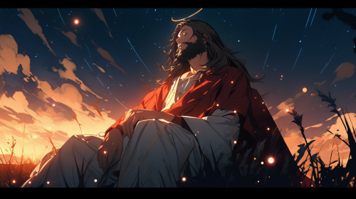 Portrait of Jesus sleaping on gtass field at night waching stars, distorted realism, use all bright colors, full HD 24K, sharp on details --ar 16:9 --niji 5 --s 250