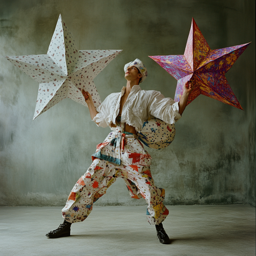 A white male model dressed in avant-garde fashion dances with three large paper mexican stars piñatas floating above him, photographed in the style of Annie Leibovitz.