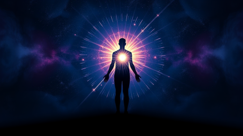 Create a mystical and vibrant image featuring a glowing fruit in transition from a carbon-based body to a crystalline structure. The figure should radiate high-frequency light, slowly transforming into a crystal-like form. Surround them with cosmic energy waves, bright stars, and a subtle galaxy in the background. Include shimmering hues of blues, purples, and whites to symbolize spiritual awakening and higher consciousness. The overall feel should be ethereal, uplifting, and filled with spiritual energy. --ar 16:9