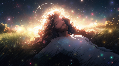 Portrait of Jesus sleaping on grass field at night waching stars, distorted realism, use all bright colors, full HD 24K, sharp on details --ar 16:9 --niji 5 --s 250