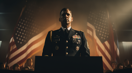 a movie poster montage of alan ritchson running, an army jeep speeding, the american flag, a army hat, cinematic, noir, realistic, 8K --ar 16:9