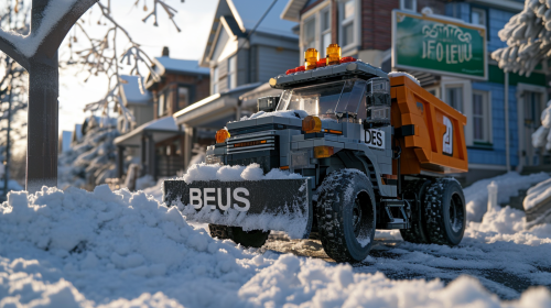 A Snow removal operation in acanadian suburb street in winter time featuring gray domp truck. Orange wheel loader full sized LEGO with a huge flag that says "DES BLEUS" --ar 16:9 --v 6.0