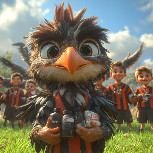 pixar style happy wolf-headed eagle with wings underneath a group of young boys in black and red striped jerseys posing messily with training products in their hands, grass on the ground, training field, open sky, --s 750