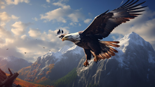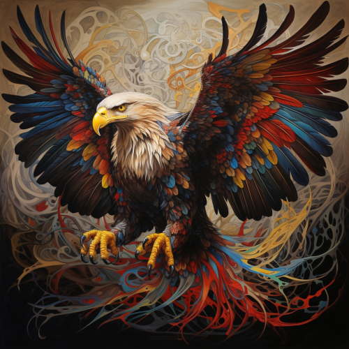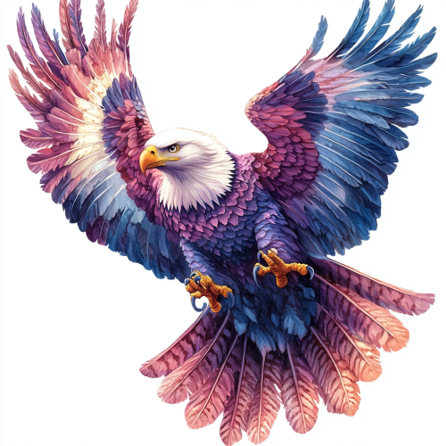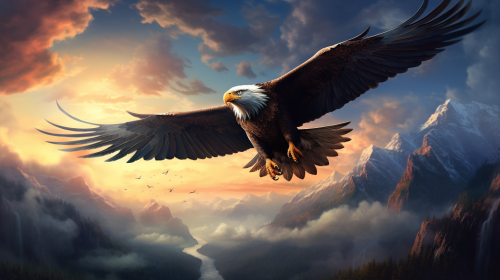 "Imagine Donald Trump riding on a majestic bald eagle flying high in the sky, carrying a figure in a suit, holding onto the eagle’s back with confidence. The eagle’s eyes glow with powerful lasers, cutting through the clouds, and the sky around them is a stunning mix of sunset colors. The scene is both epic and surreal, showcasing freedom and strength." This setup captures the drama and intensity, adding an imaginative twist while staying more open to interpretation!