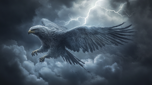A majestic griffin with eagle wings and a lion’s body, flying through a stormy sky. Lightning strikes behind the creature, illuminating its powerful form. The feathers and fur are intricately detailed, with dynamic motion as the griffin soars through the clouds. Dark, dramatic fantasy art style. --ar 16:9