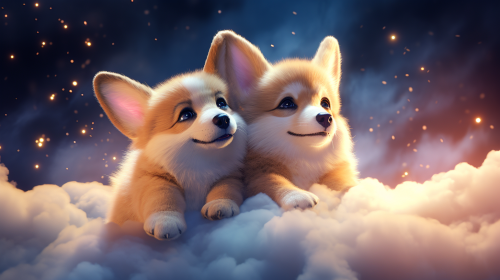 Two cute corgi puppies cuddling in the clouds, stars twinkling overhead, in the style of Disney, cute, adorable, fluffy fur, happy expression, in the style of Pixar animation, colorful, soft lighting, close-up, high resolution, 3D rendering, high detail, high quality. --ar 16:9 --v 5.2