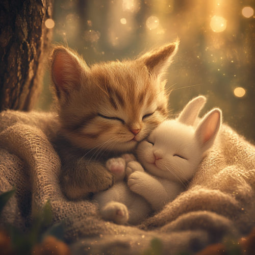 Create a high-quality, 4K square image of something very heartwarming and irresistibly cute. The scene should feature an adorable interaction, such as a tiny kitten cuddling with a baby bunny under a soft blanket, or a child gently holding a baby animal, both smiling peacefully. The background could be a cozy, warm room or a serene outdoor setting with gentle lighting. The atmosphere should radiate comfort, affection, and innocence, with soft textures and warm, inviting colors. The overall style should blend hyper-realistic details with a touch of whimsy, creating a visually captivating scene that brings out a feeling of pure sweetness and joy.