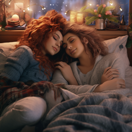 two beautiful gay girls cuddling in a cozy bed and are happy, 4K, hyperrealistic, photography --v 5.2