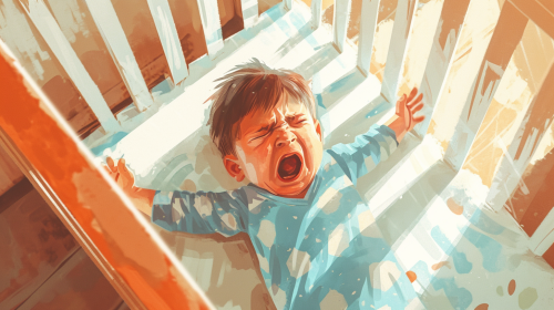 A cute illustration of a clever baby crying in its crib to prevent its parents from cuddling. --ar 16:9 --v 6.0