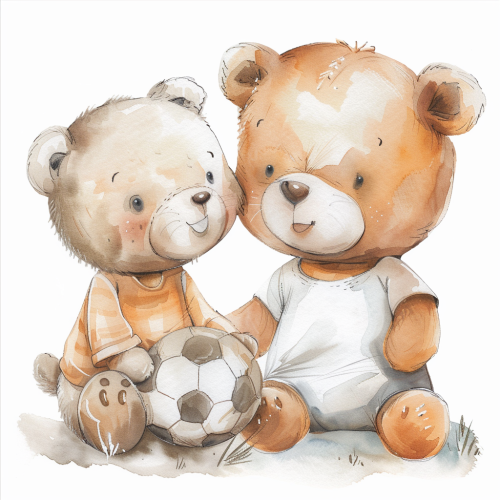 soft warm colors, light brown, beige and white only, neutral for baby clipart, really soft, smooth smiling adorable cute teddy bear wearing a soccer jersey playing soccer with another teddy bear wearing a soccer jersey clipart, white background