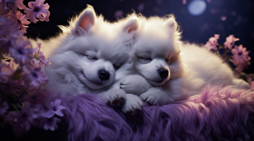 Two cute, fluffy white puppies cuddling on top of each other, in the style of Pixar, with cartoon flowers in the background, a purple sky with a moon at night, creating a dreamy, magical, and glowing scene with high definition and high resolution. --ar 128:71 --v 5.2