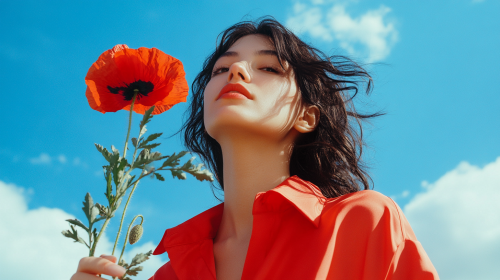 A ultra realistic photograph of Stylish woman in red shirt holding by hand beautiful flower of poppy on blue sky background The image was captured using a Canon EOS R5 with 50mm --ar 16:9