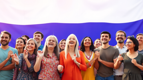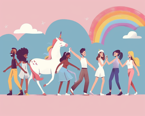 a group of happy people of different races all holding hands, racial harmony, a unicorn and a rainbow --ar 5:4 --v 6.0 --s 50