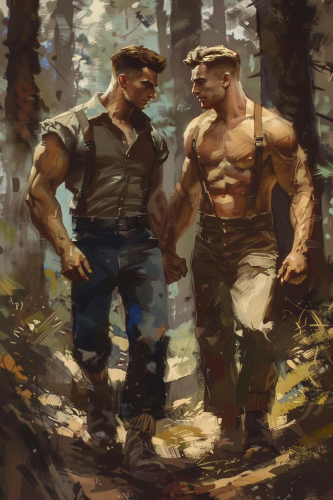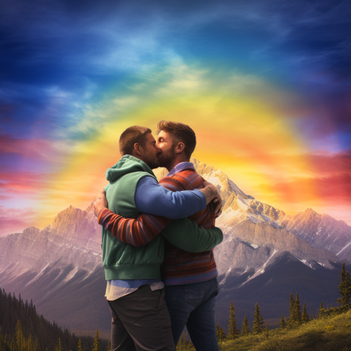 two gay men embracing in a loving hug with a beautiful mountainscape and rainbow behind them.