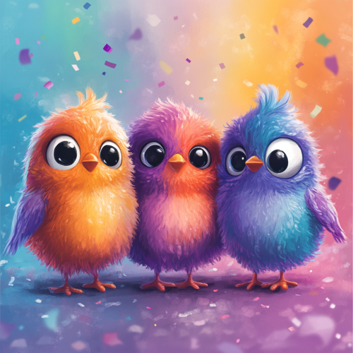 three adorable, fluffy birds with large eyes, each in a different color: purple, orange, and blue. They are standing side by side, and the background features a vibrant rainbow. The overall feel is playful and cute, with the birds looking expressive and friendly, making it look like an illustration from a colorful, cheerful animation or children's storybook. There are also confetti-like elements, adding to the festive and joyful atmosphere.