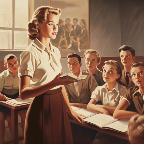 an attractive female teacher teaching a class of 1950s boarding school kids in uniforms about obsolete information