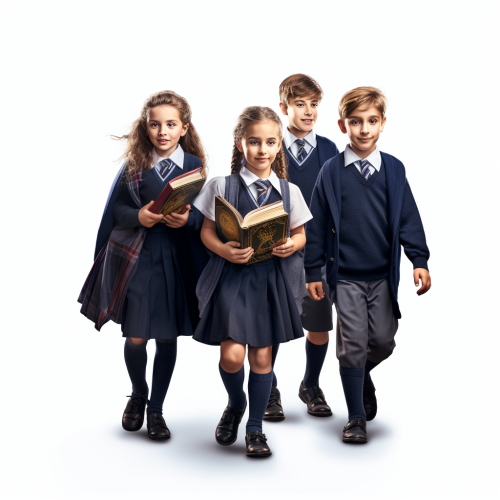 A photo of four primary school students from a British aristocratic school, wearing a dark blue knitted vest and school uniform, walking happily holding a book, the warm light of the movie is white background, real photo, realistic, 8k, realistic, super detailed