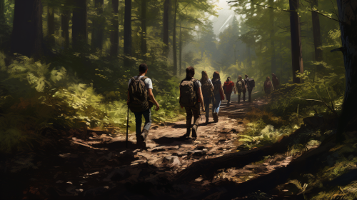 The group is hiking along a forest trail. hyperrealistic --ar 1280:720