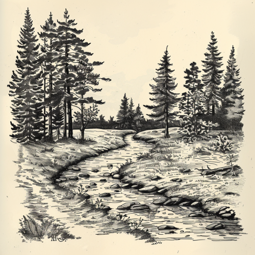 river stream next to running trail, forest scene, horizon, surreal, style sketch --v 6.0 --style raw --s 250