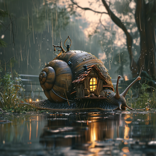 pixar style, disney style, cartoon style, giant snail which has a house hanging by straps on the shell, the snail is in the rain, the snail is placed on a wet ground with puddles, there are reflections in the water of the scenery, there are splashes of water surrounding the snail, raw style --v 6.0