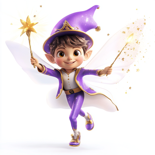 3D Disney Pixar style a mix of a beautiful male fairy boy dressed as a handsome wizard with hypersaturated strong purple and white clothes, full body flying full of charm, white wings, golden boy fairy dust, holding wands with a wizard hat. white isolate background.