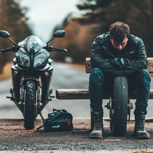 A person sitting on a bench next to their motorcycle, looking visibly unwell or exhausted. The motorcycle is parked beside the bench. The person should appear to be considering their physical state and the need for rest or medical attention. Include a phone or a first aid kit nearby to emphasize the importance of not driving when physically unable. The background should have a blurred road or a road sign to provide context.