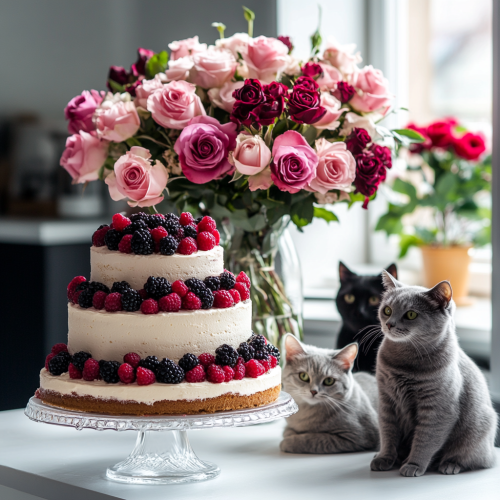 hd photo, a three-tiered cake with berries on a white table. In the background is a beautiful bouquet of pink roses in a glass vase. A black cat, a tabby cat and a gray kitty are sitting nearby, they look very pleased. Sunny morning, good mood. High quality photo.