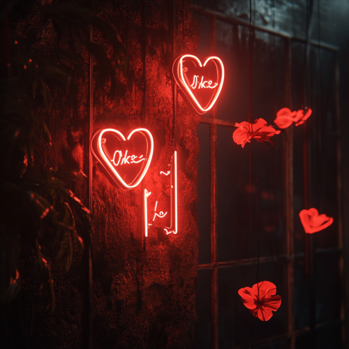 dark wall where neon signs of broken broken hearts are hanging, dark red neon kisses sign, with floating red flowers, dark atmosphere, neon atmosphere, realistic, high resolution, real details, fine textures front view, 8k, cinematic, color grading, real photo, Taken with a Canon AE-1 using 35mm Kodachrome film. In the style of Philip-Lorca diCorcia's photography.