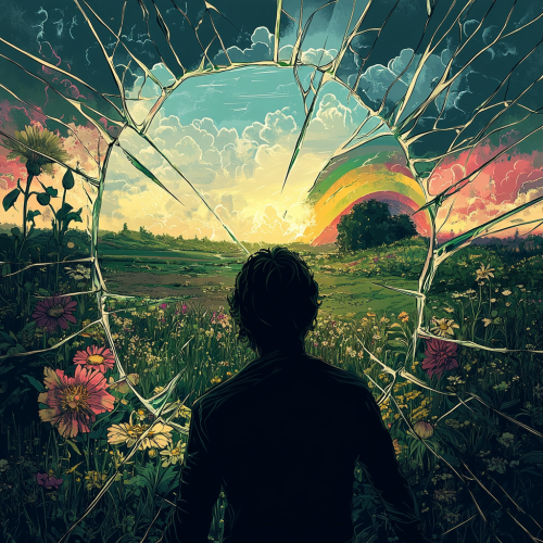 surrealist realistic illustration of a silhouette seen in the back looking at a broken glass where you can see a landscape with flowers and a rainbow through the broken glass