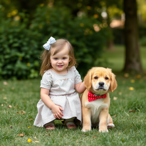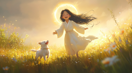 A young Korean girl, appearing as a serene bodhisattva with a glowing halo around her head, playing joyfully with a small dog in a sunlit field. Her long black hair flows behind her as she runs, laughter evident in her expression. The scene is vibrant and lively, yet filled with a sense of calm and peace. The background features soft grass and wildflowers, painted in an oil painting style with warm colors and gentle brush strokes, capturing a healing and harmonious atmosphere. --ar 16:9