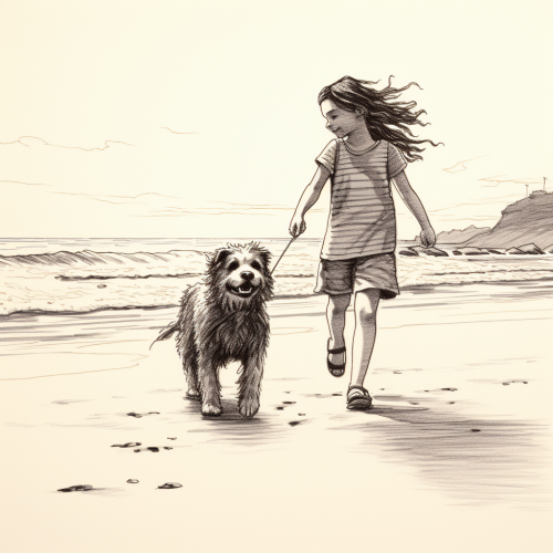 amazing view of a my dog and his friends the seagulls playing with him, beautiful beach morning, big beach waves, blue sky , volumetric lighting, wide angle --ar 1:2 --s 600 --c 10