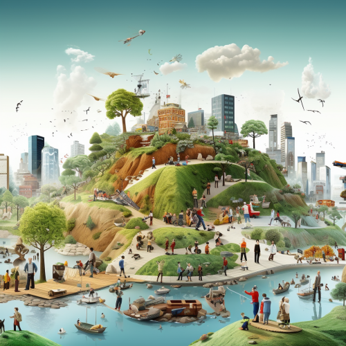 different ecological enviornments, such a forest, desert, city, river, village, and beach with a diversity of people that include men in suits looking like they are making important decisions, young people protesting, women shopping, men playing golfs, politicians standing at podiums, army troops marching, babies and children playing with toys, families walking their dog, couples argueing