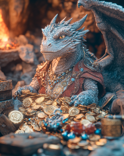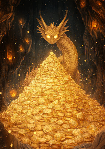 wide angle photo. an ancient, scarred and weathered dragon sits atop a pile of gold coins and jewelry. The scene is set in a cave with distant lava light glinting off the gold. --ar 4:5 --s 750 --p 3pk727f