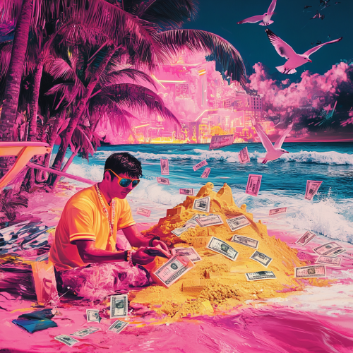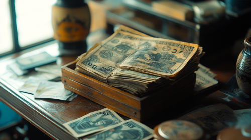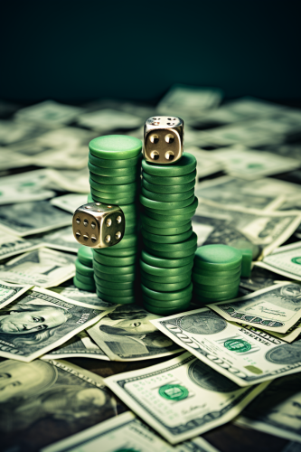 a pile of green dice sitting on top of a pile of money next to stacks of money and stacks of stacks of coins --ar 2:3 --v 5.2