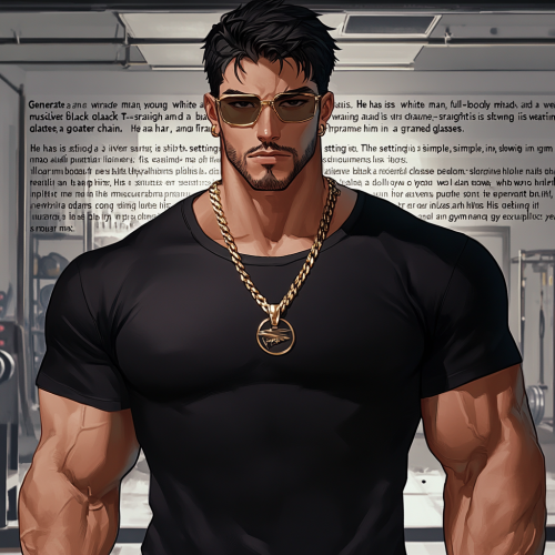 "Generate an image of a young white man, full-body and very muscular, realistic. He is wearing a black T-shirt and a silver chain. He has straight black hair, a goatee, and is wearing gold-framed glasses. The setting is simple, showing him in a gym. His expression is calm, with a slight smile, reflecting a casual and relaxed atmosphere."