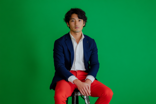 A young Japanese man of 19th century, wearing Hundosi, sitting in the single black leather sofa with armrest, both arms on the armrest, on the perfect center, on the black floor, solid black background, 8k