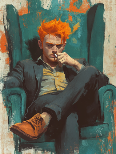 Illustration of a young, cool man sitting in a chair, legs crossed, smoking a cigarette. Full body illustration from toes to head. Orange hair with an outside curl. Rough appearance with shirt sleeves rolled up. He is wearing a suit jacket. --ar 3:4
