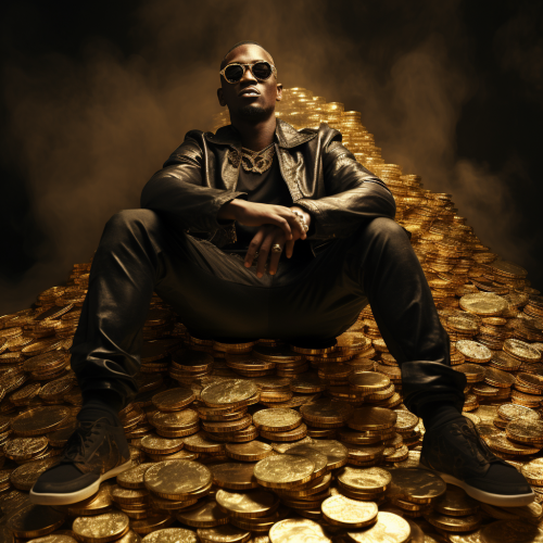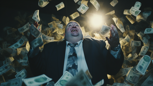 evil vilian fat business man holding a light bulb in one hand standing in a pile of money, shot on 35 mm film, colorful, anamorphic lenses, cinematic, --ar 16:9